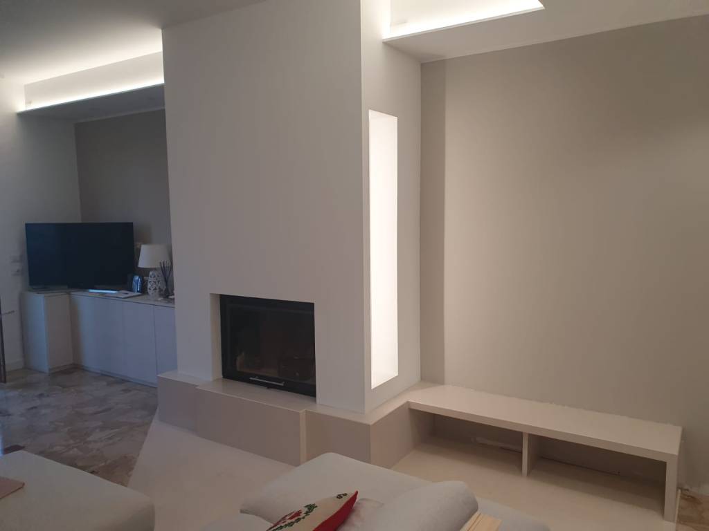 Gli obiettivi principali sono stati l’abbattimento di una parete adiacente all’ingresso che, essendo una abitazione costruita tra gli anni ’60 e ’70, era predisposta a un ampio corridoio che delimitava l’ingresso a destra nella cucina e a sinistra nel soggiorno, ma al tempo stesso diventava uno spazio perso e inutilizzato, e la sostituzione del camino con un termo camino con rispettivo impianto termico in tutte le aree dell’abitazione situato al soffitto controsoffittato.