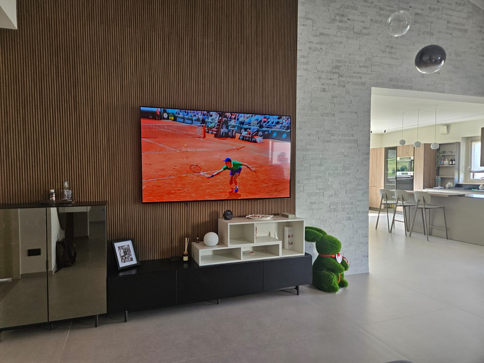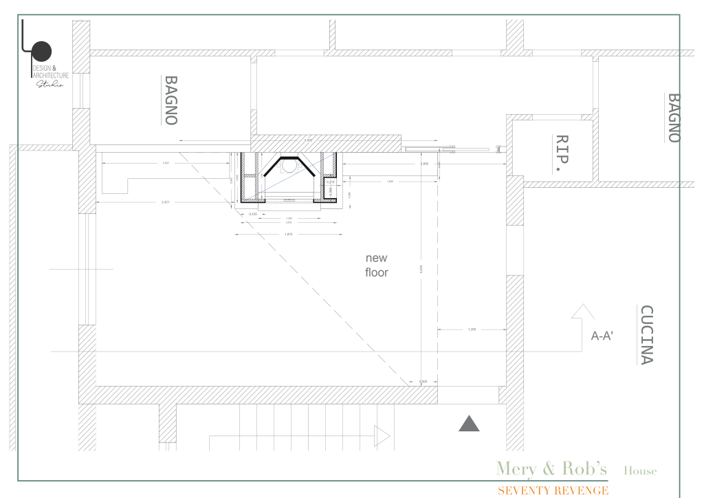 Il problema principale da risolvere era come camuffare il segno della parete abbattuta sul pavimento, visto che i clienti non volevano sostituire il marmettone poiché di ottima qualità e colorazione. La sfida era quindi trovare una soluzione creativa che preservasse l’integrità estetica dell’ambiente. Dopo varie valutazioni, si è optato per fare un taglio geometrico sul pavimento, creando una forma moderna e accattivante, e rivestirlo con una delle pietre in palette con quelle già presenti nel pavimento originario. Questo approccio non solo ha permesso di mascherare il segno in modo efficace, ma ha anche conferito un nuovo carattere e stile allo spazio. Ecco lo stato dei lavori, che ha già suscitato interesse per la sua originalità e il suo design innovativo. Dopo di che si è pensato di dare continuità al nuovo materiale utilizzato anche nella soglia del termocamino per dare un senso di modernità e raffinatezza alla zona giorno.