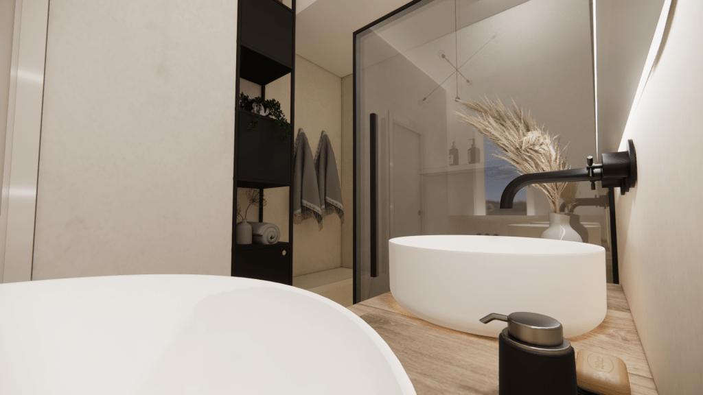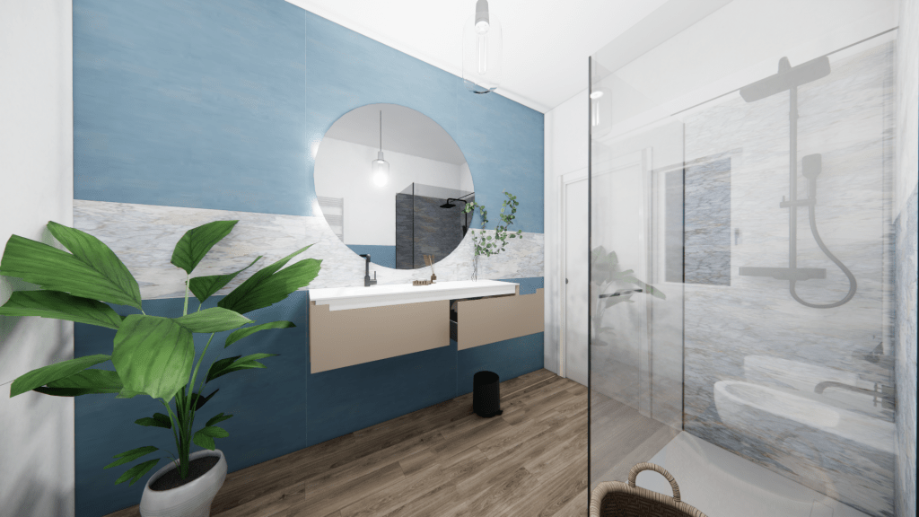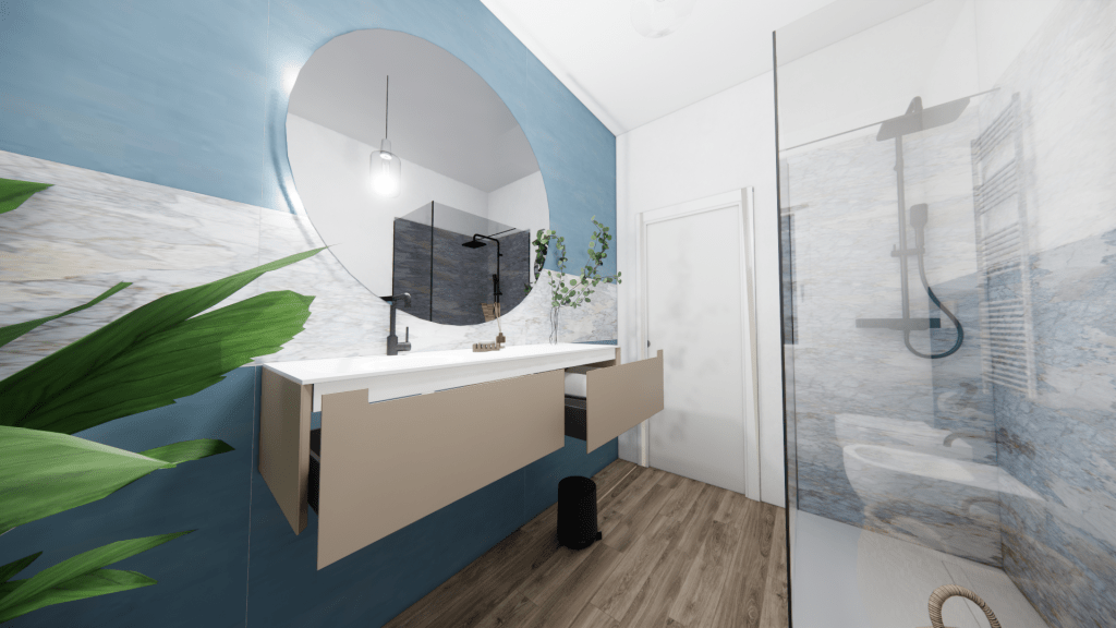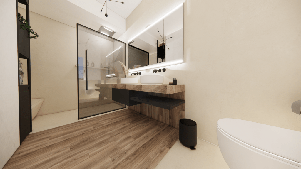 Nel bagno della zona giorno particolare attenzione va alla scelta funzionale di proseguire con il rivestimento in gres porcellanato per evitare di danneggiare il parquet con i getti d’acqua e i prodotti di pulizia sulla superficie in legno che nel tempo potrebbe danneggiarsi. La scelta di un rivestimento così pratico non solo assicura una maggiore durabilità, ma contribuisce anche ad un’ottimizzazione dello spazio, rendendo ogni angolo del bagno facilmente accessibile e curato, rimanendo sempre un bagno dal carattere unico e raffinato.
