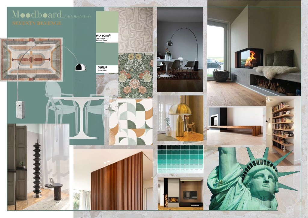 Sono partita inizialmente effettuando un’analisi accurata sulla scelta del design che preferivano i miei clienti e, dopo di che, sono partita alla progettazione; ecco la Moodboard iniziale del progetto, dove sono presenti tutte le caratteristiche cromatiche e estetiche che verranno utilizzate durante la progettazione.