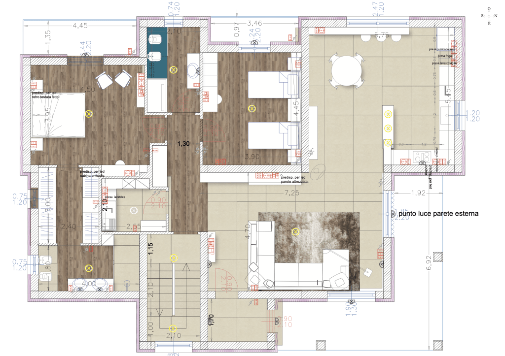 In pianta sono raffigurate le disposizioni dell’impianto elettrico, l’arredo e la tessitura dei materiali di rivestimento. In questo caso i miei clienti hanno scelto un Cotto di Faenza dalle dimensioni di 120×120 cm abbinato a un Parquet in Rovere spazzolato. Si è cercato di creare un’alternanza tra il Cotto e il parquet per diversificare la zona notte e la zona giorno; la scelta del cotto nella zona giorno è dovuta anche alla maggiore resistenza all’usura rispetto al parquet, difatti nelle zone come la cucina e nel bagno, precisamente al di sotto dei sanitari, è presente il cotto. Questo materiale, con la sua superficie ruvida e le sue tonalità calde, contribuisce a creare un’atmosfera accogliente e dà un tono sofisticato, in grado di valorizzare ulteriormente l’arredamento scelto dai clienti. Inoltre, l’abbinamento con il parquet in rovere spazzolato non solo offre un contrasto piacevole dal punto di vista estetico, ma garantisce anche praticità e comfort al calpestio. La combinazione di questi due materiali permette di andare a definire, in modo distintivo, le diverse aree della casa, promuovendo al contempo un’armonia stilistica che si estende a tutto l’ambiente.