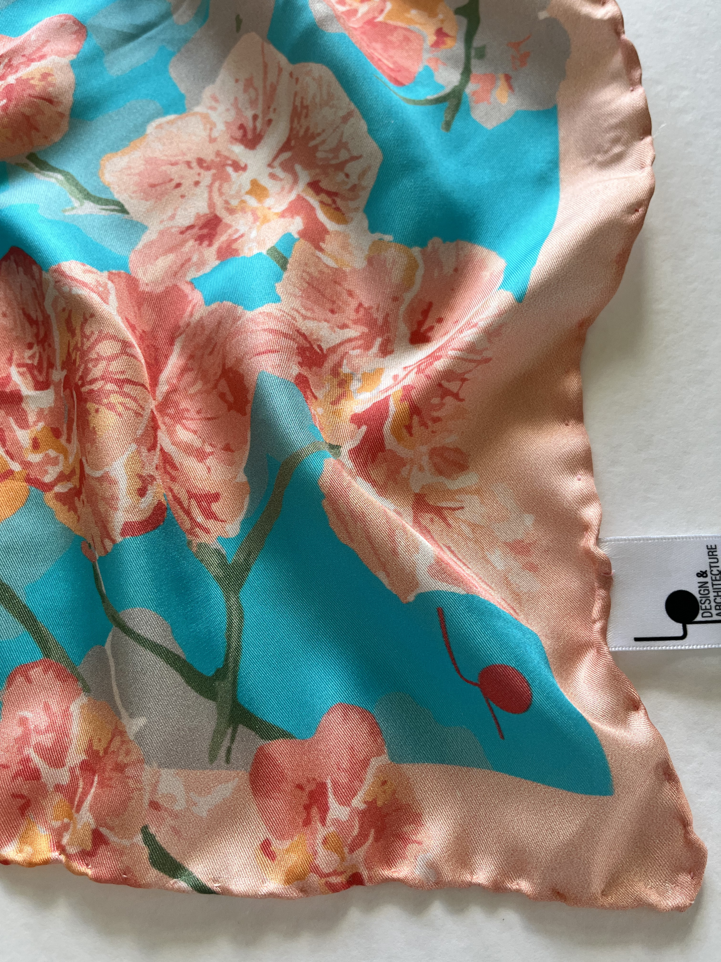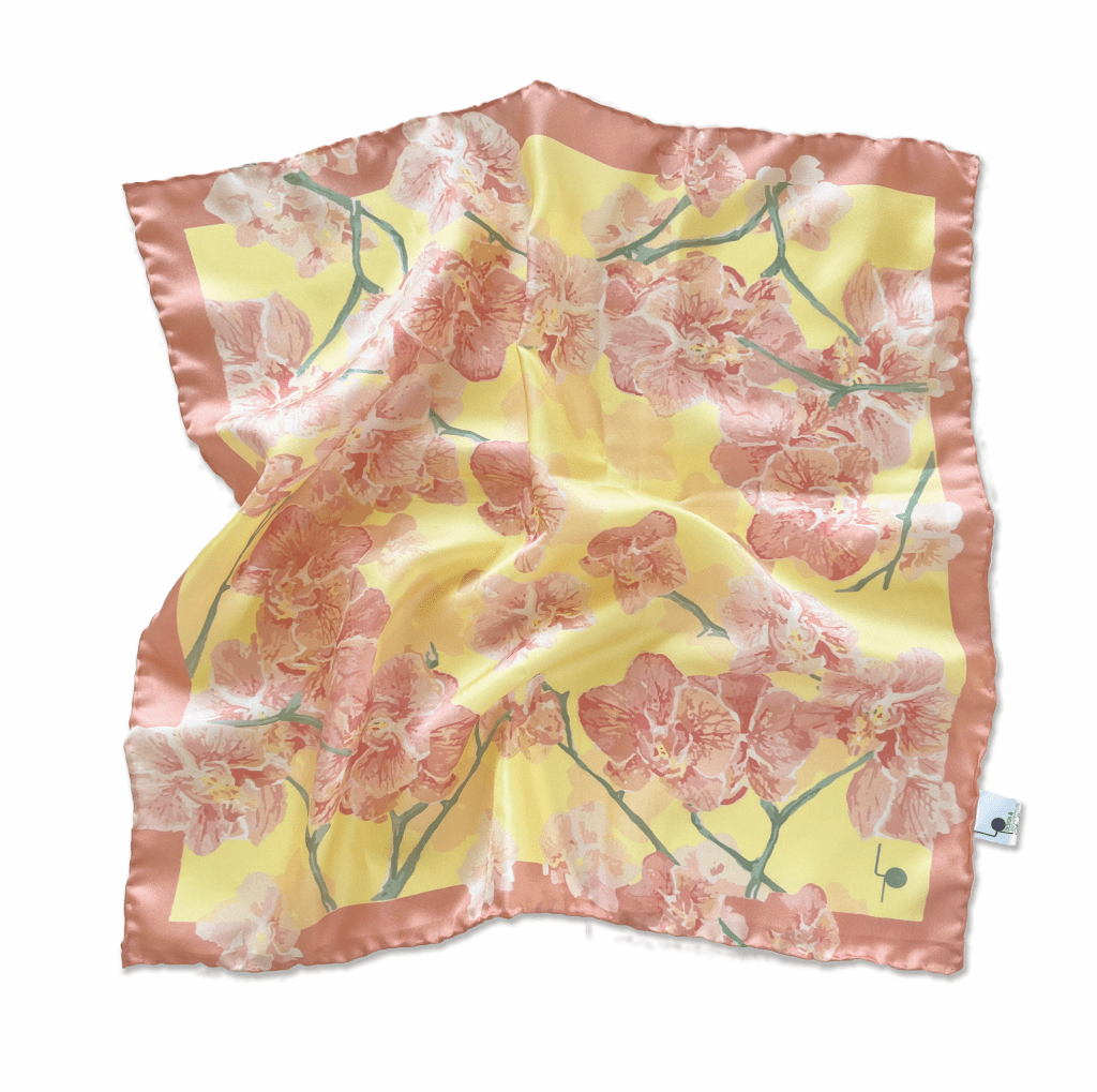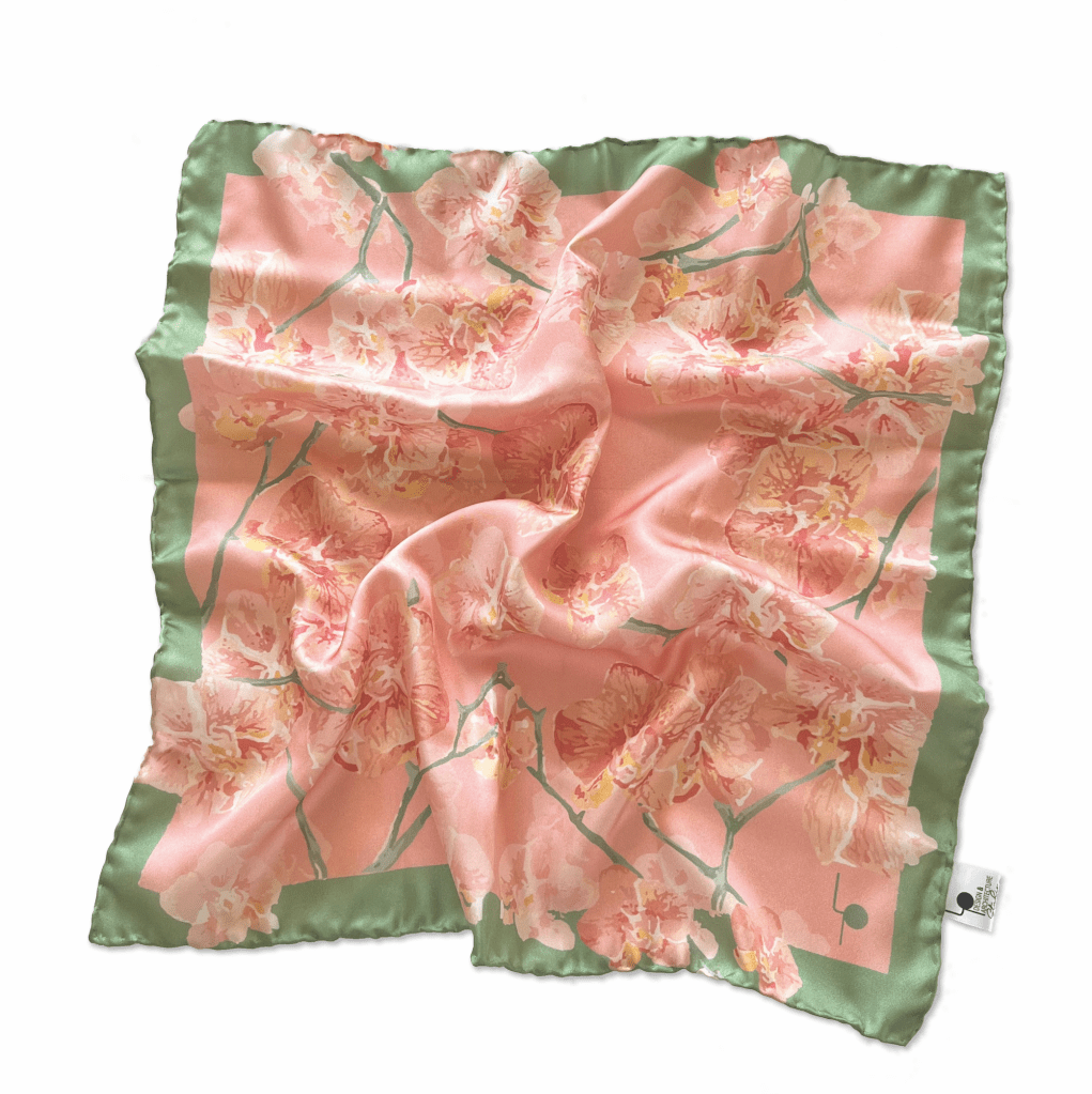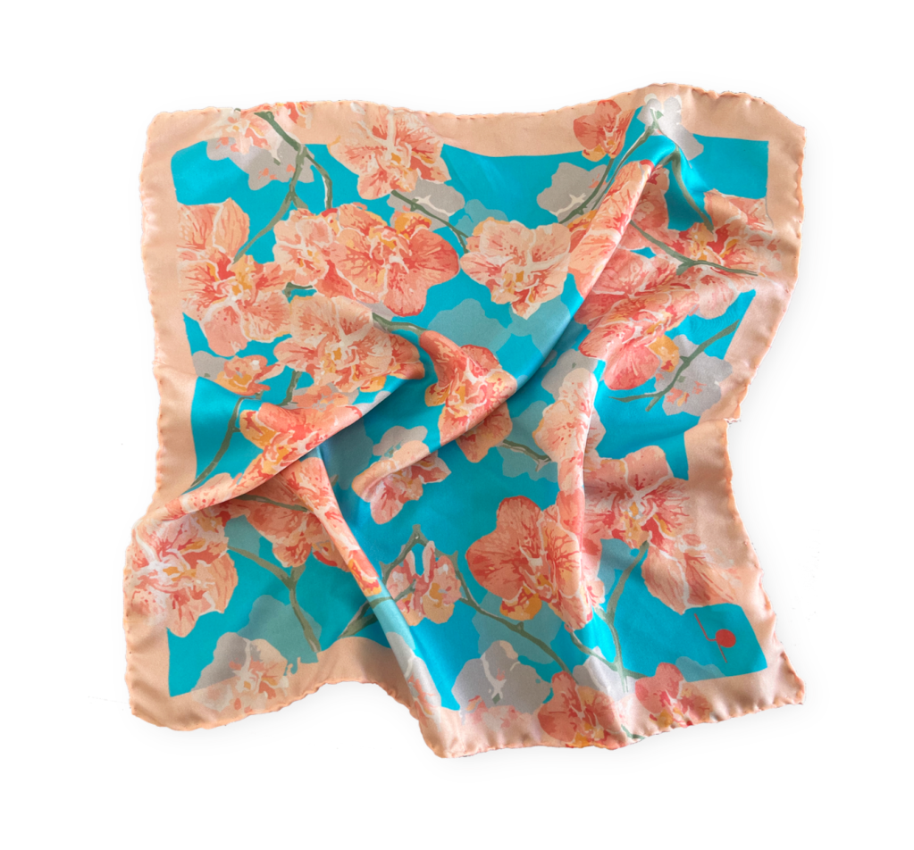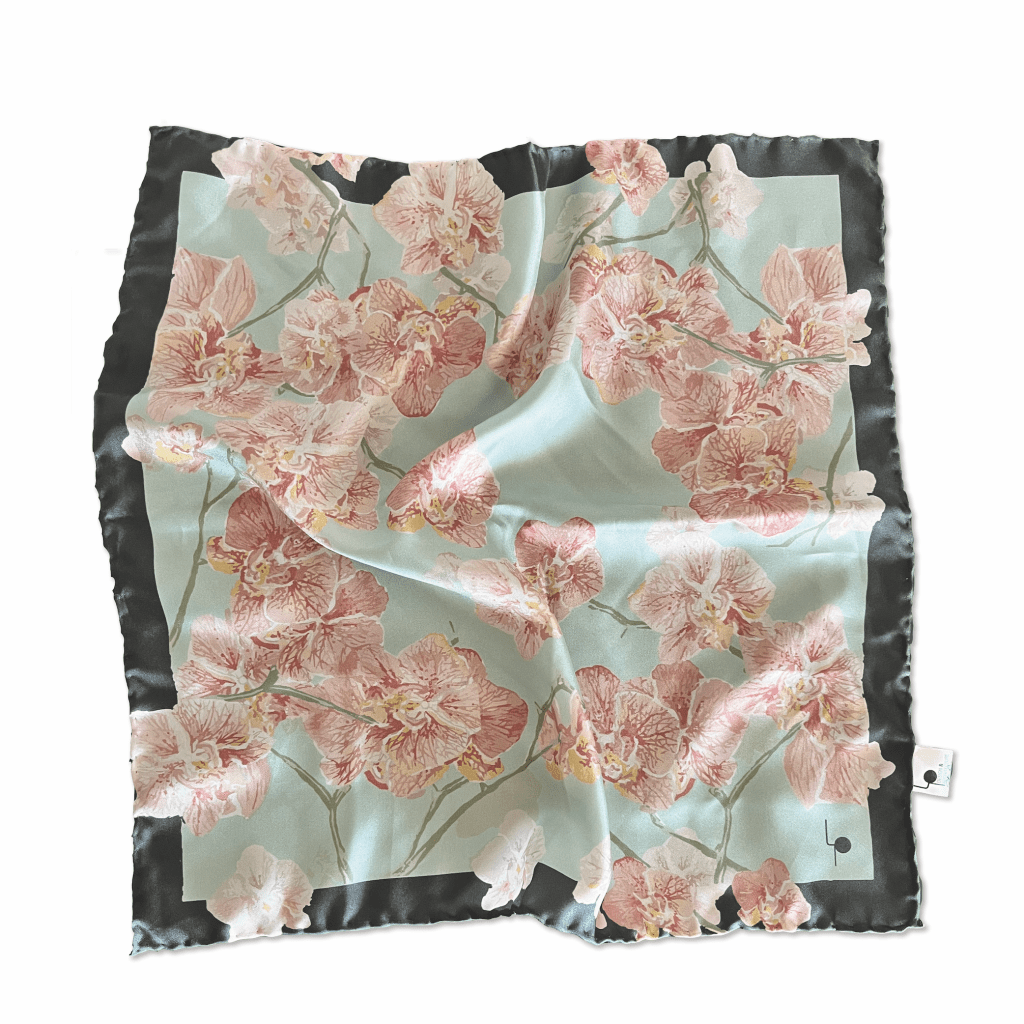 L’orchidea rappresenta la bellezza, l’eleganza, la passione e l’amore; donarla a una persona cara comunica la sua importanza nella nostra vita. Il foulard è interamente orlato a mano, rendendolo un prodotto artigianale italiano.